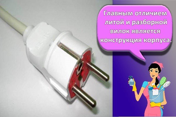 Главным отличием литой и разборной вилок является конструкция корпуса. У литой модели корпус выполнен в форме цельного неразборного элемента, внутри которого надежно закреплен сетевой шнур и контакты. Разборная вилка более удобна при необходимости замены и устанавливается в большинстве современных электроприборов. Корпус состоит из двух половинок, соединенных при помощи одного либо нескольких болтов.