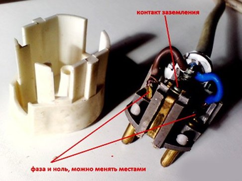 Если у Вас обычная советская электрическая вилка, которую нужно поменять и в то же время в доме электропроводка без заземления, методика замены будет немного другой, а именно: