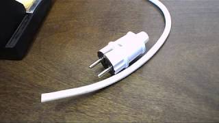 Мне попалась поляризованная вилка стандарта SEV 1011 или IEC 60906-1, точно не скажу, так как они практически одинаковые. Расстояние между штырями вилки составляло 19 мм, диаметр штырей 4 мм, как у вилок С5. Но в отличие от С5 имелся дополнительный штырь заземления, который не позволял вставить вилку в розетку.